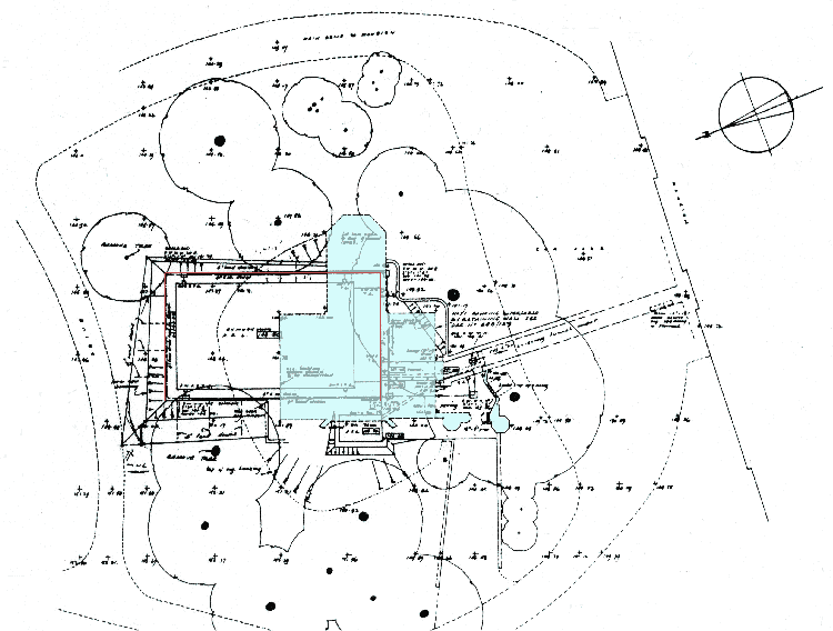 Note: showing location of demolished chapel (blue). Gymnasium outlined red. |